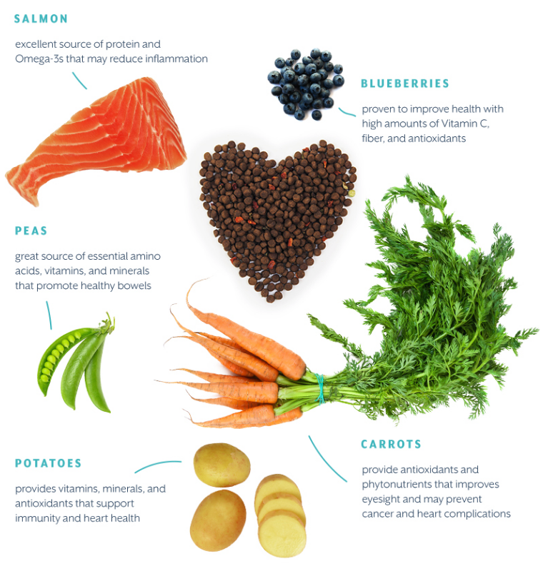 “Our grain-free salmon, lamb and chicken recipes are rich in proteins, full of fruits and veggies that add natural fiber as well as essential vitamins and minerals that are vital for healthy bones as well as teeth. Furthermore, the Omega-3 and Omega-6 fatty acids in fish oil and antioxidants in berries contributes to a healthier skin and coat,” says Goldman.