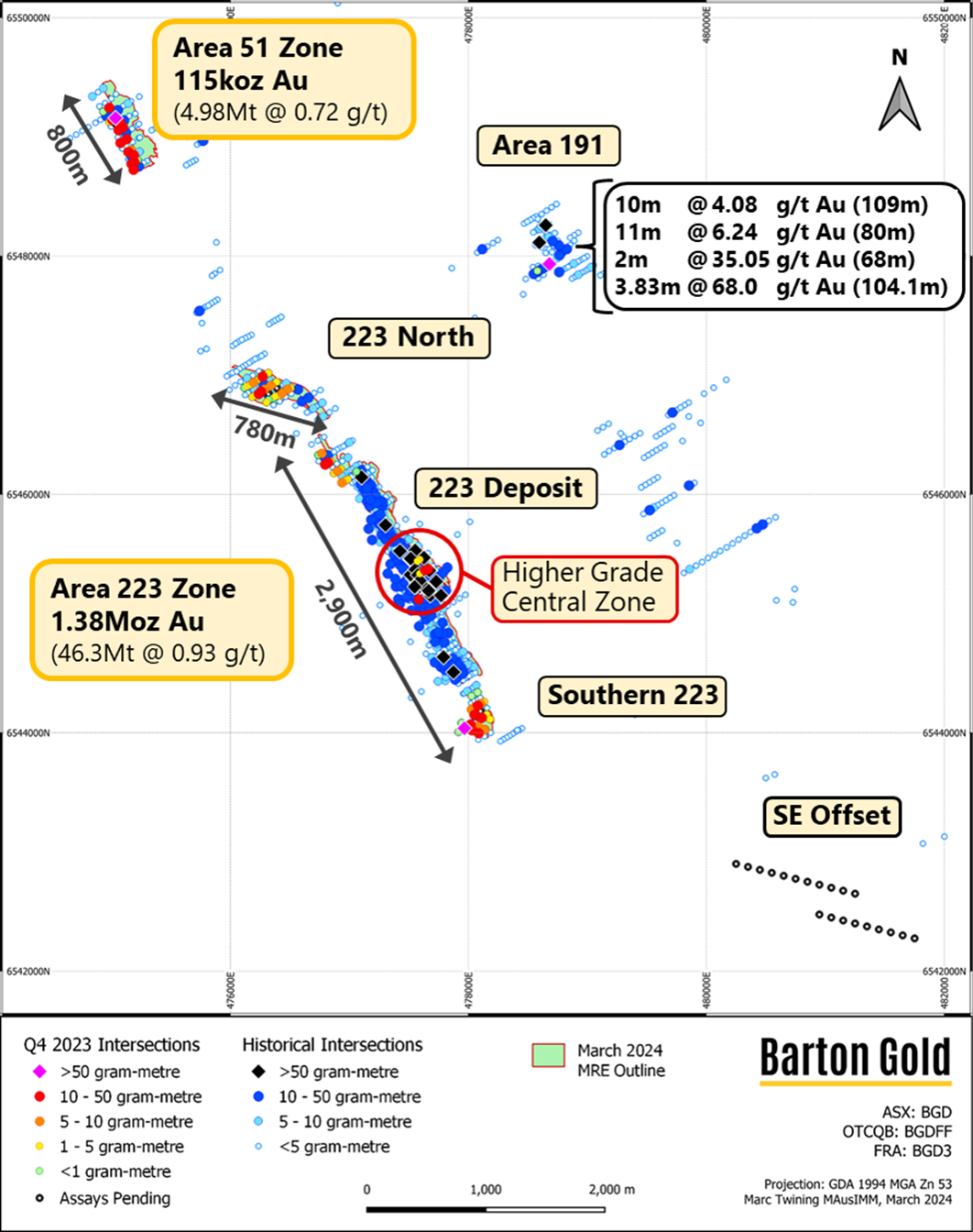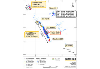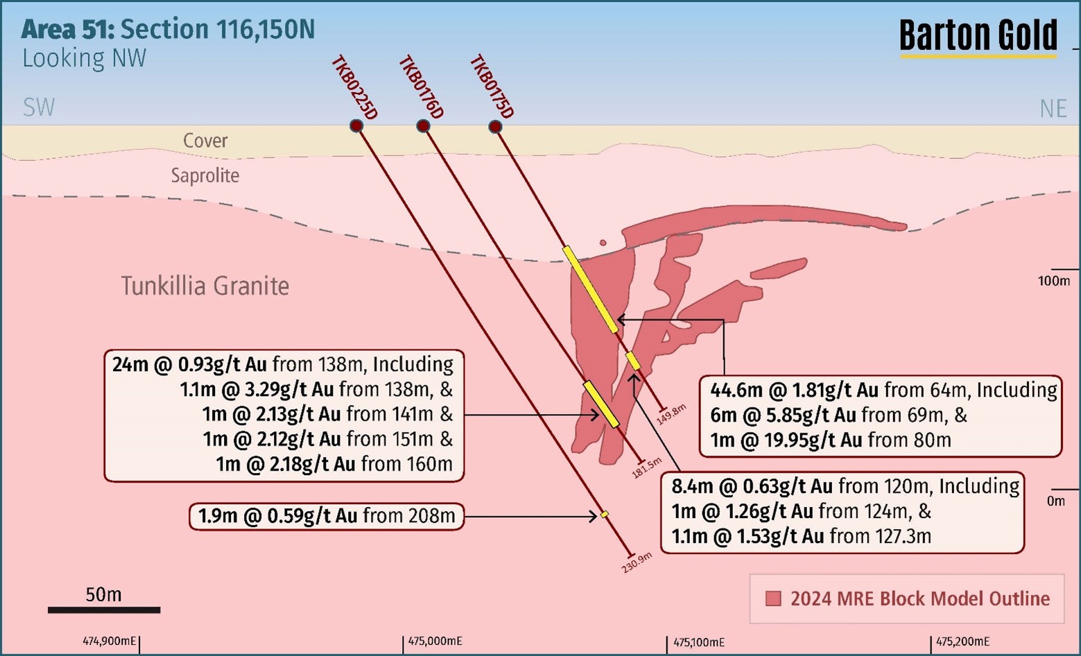 In early 2023 Barton completed a further 2,118m RC and 856.9m DD drilling, announcing the extension of Area 51 to ~700m length in April 2023 with key results including 28.55m @ 1.32 g/t Au from 91.45m.2
