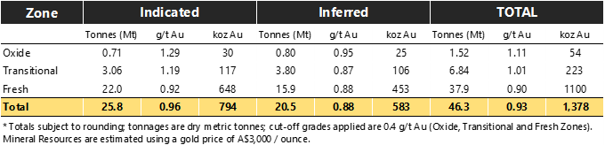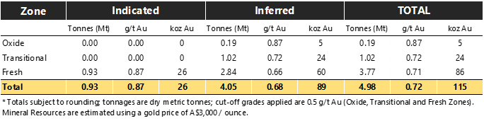 - 1.15Moz Au Mineral Resources (38Mt @ 0.94 g/t Au)*