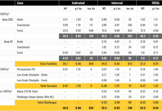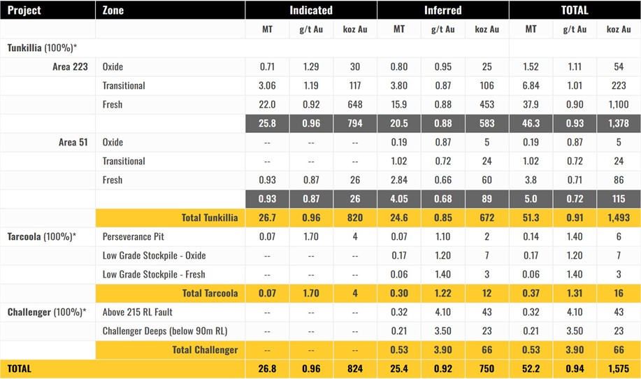 * Table shows complete JORC Mineral Resources Estimate (MRE) for each Project on a 100% basis. Figures subject to rounding; tonnages are dry-metric tonnes; all Mineral Resources classified as ‘inferred' are approximate; cut-off grades applied are 0.4 g/t Au (Tunkillia Area 223), 0.5 g/t Au (Tunkillia Area 51), 0.4 g/t Au (Tarcoola), 2.0 g/t Au (Challenger).