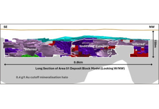 Drilling has defined a new 115,216koz Au MRE at Tunkillia's Area 51 zone (4.98Mt @ 0.72 g/t Au). JORC MRE modelling has been restricted to ~150m depth from surface at a 0.5 g/t Au cutoff grade, with a further broad, continuous halo of surrounding mineralisation (modelled on a 0.4 g/t Au cutoff grade).