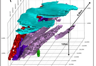 Mineralisation above the base of weathering is assumed to be affected by supergene or weathering effects and is interpreted as dominantly horizontal lenses. Four fresh rock mineralized structures were interpreted, based on continuity of grade at a lower cut-off of 0.35 g/t Au at the A51 deposit. Structures were grouped into geostatistical domains based on grade similarities and structural orientation. A51 strikes grid (local) north-west and dip steeply west.