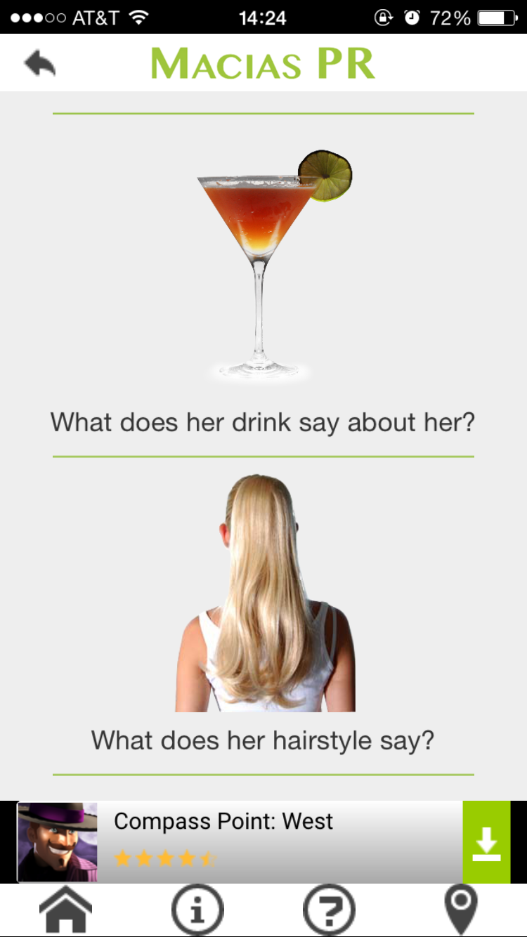 The mobile app has a visual guide to help users read body language based on what they are seeing in that moment. It also provides gimmicks with visual aides (for example – a purse, wallet or watch) that take any conversation to a higher level.