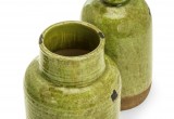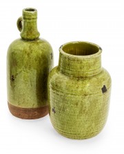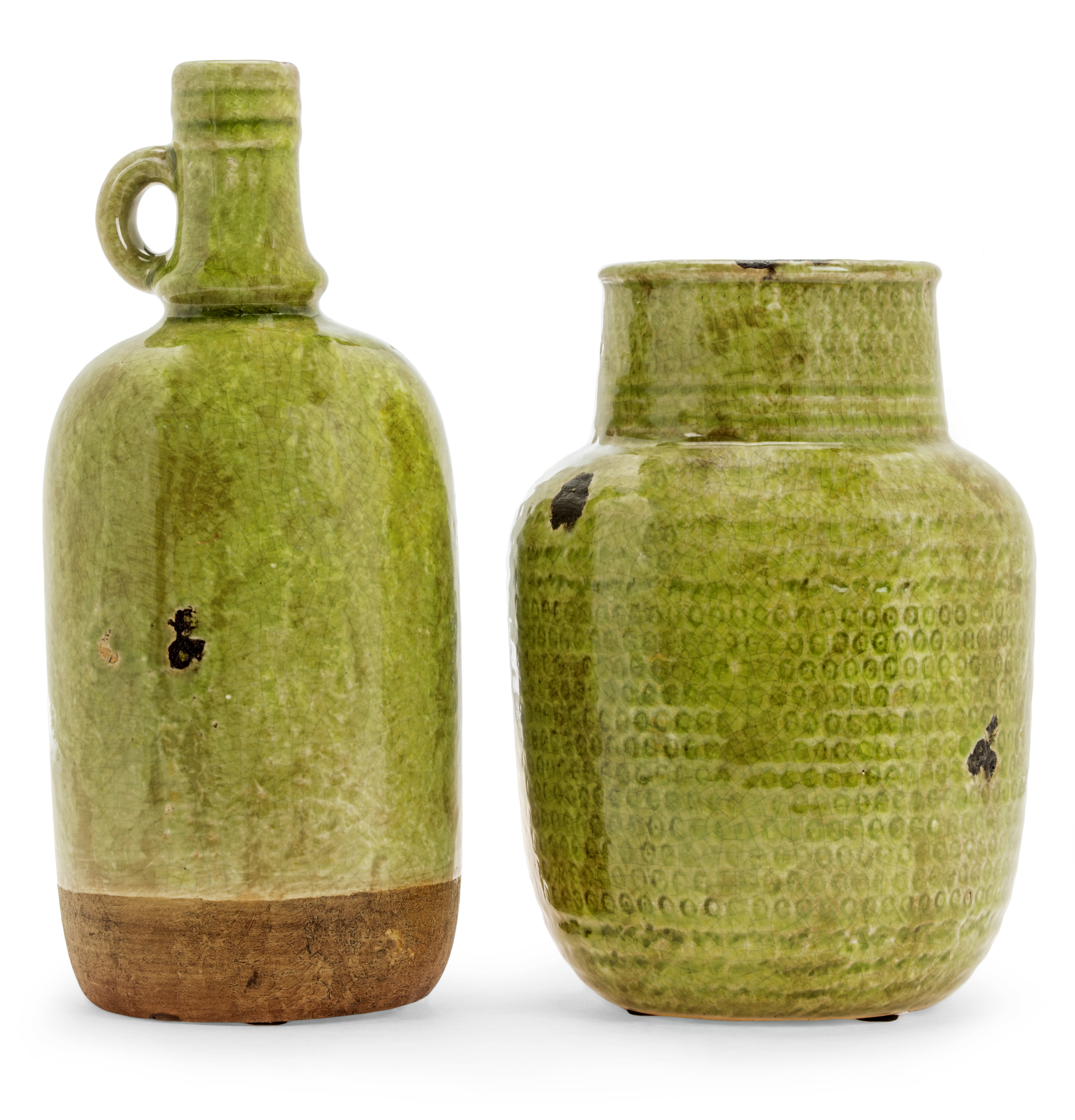 The shorter of the two pots features a pattern of irregular circles that circumnavigate the entire piece. And perhaps the most striking aspect of this set is the enchanting green coloration selected by the craftsmen who formed these pieces.