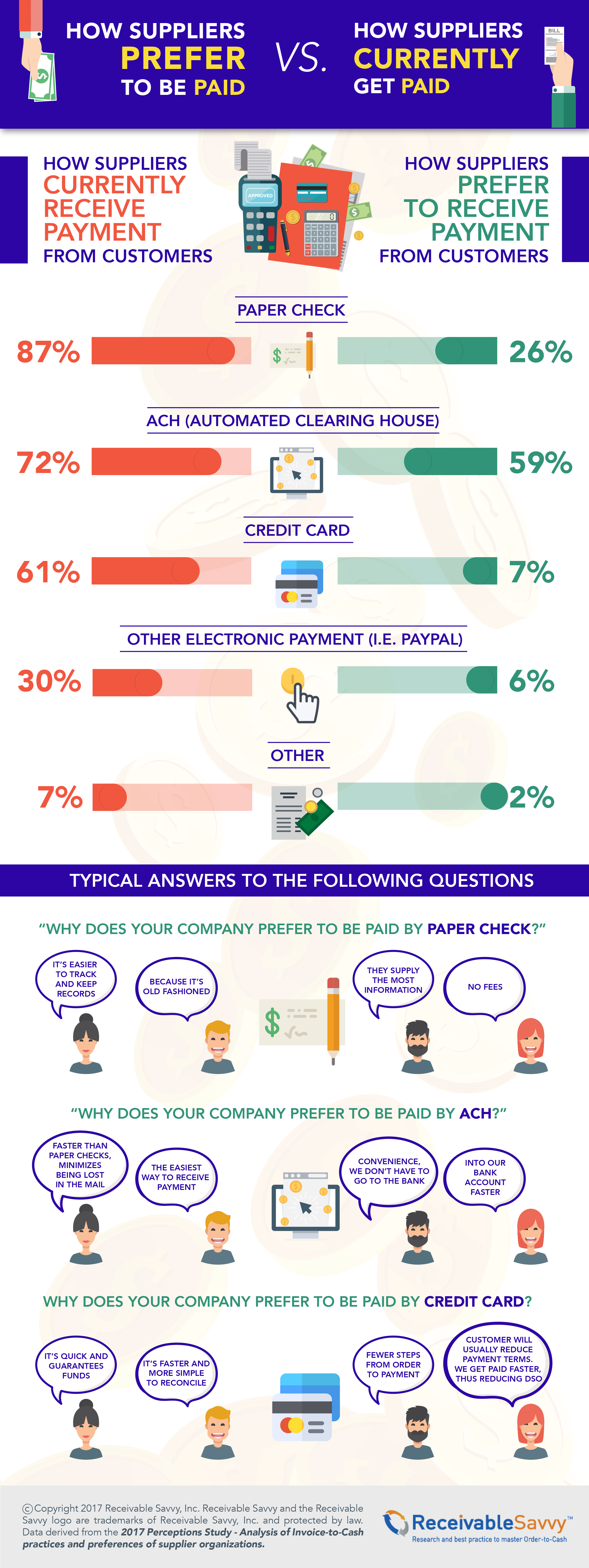 "This new infographic illustrates the disconnect between suppliers and customers when it comes to paper checks, credit cards, ACH and other forms of payment," said Ernie Martin, Founder and Managing Director of Receivable Savvy. "The infographic also includes specific reasons supplier organizations give for preferring one payment method over another."