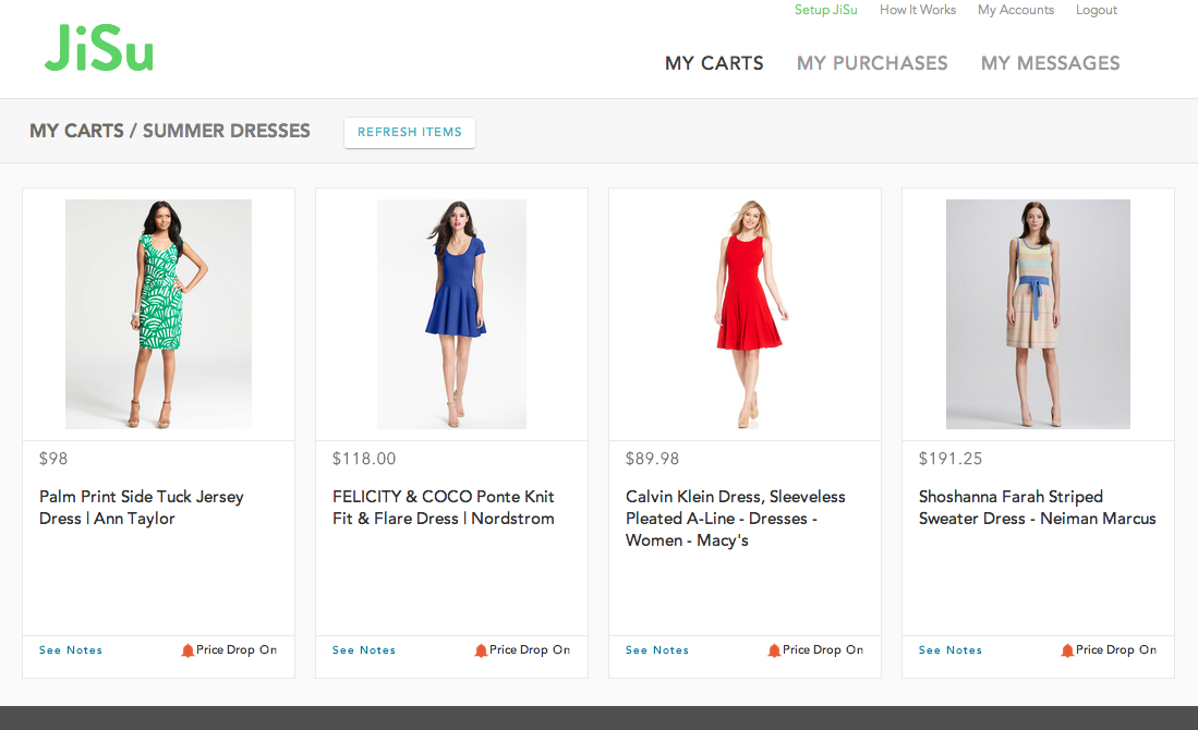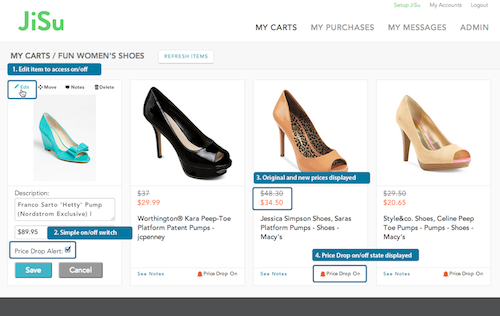 JiSu assists shoppers with online research and product comparisons by enabling members to save items across different websites to their private, universal shopping carts. Price drop alerts improves the JiSu cart's product comparison features by monitoring changes in price.