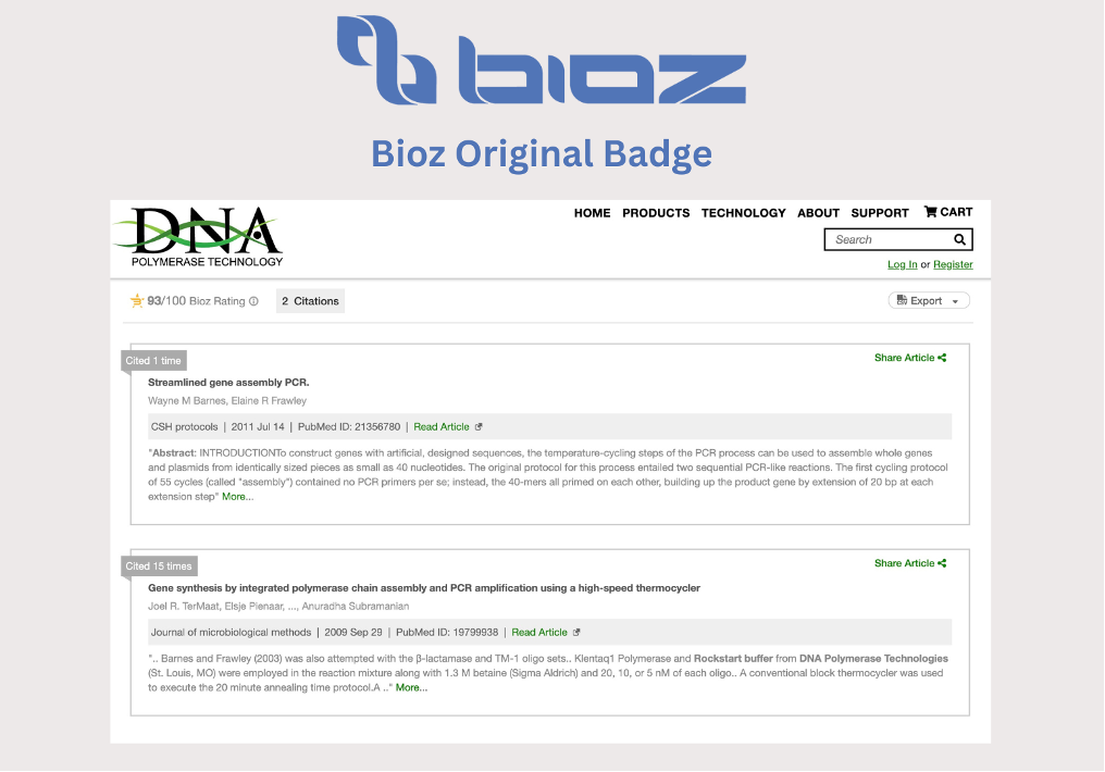 The innovative AI-powered Bioz Badges provide a unique way to display key citation data directly on the website, enabling visitors to see article snippets that reference DNA Polymerase Technology in pre-print and peer-reviewed publications. These interactive badges showcase critical excerpts from scientific articles. This gives researchers the ability to quickly assess how products have been applied in research, all without leaving the supplier’s website.