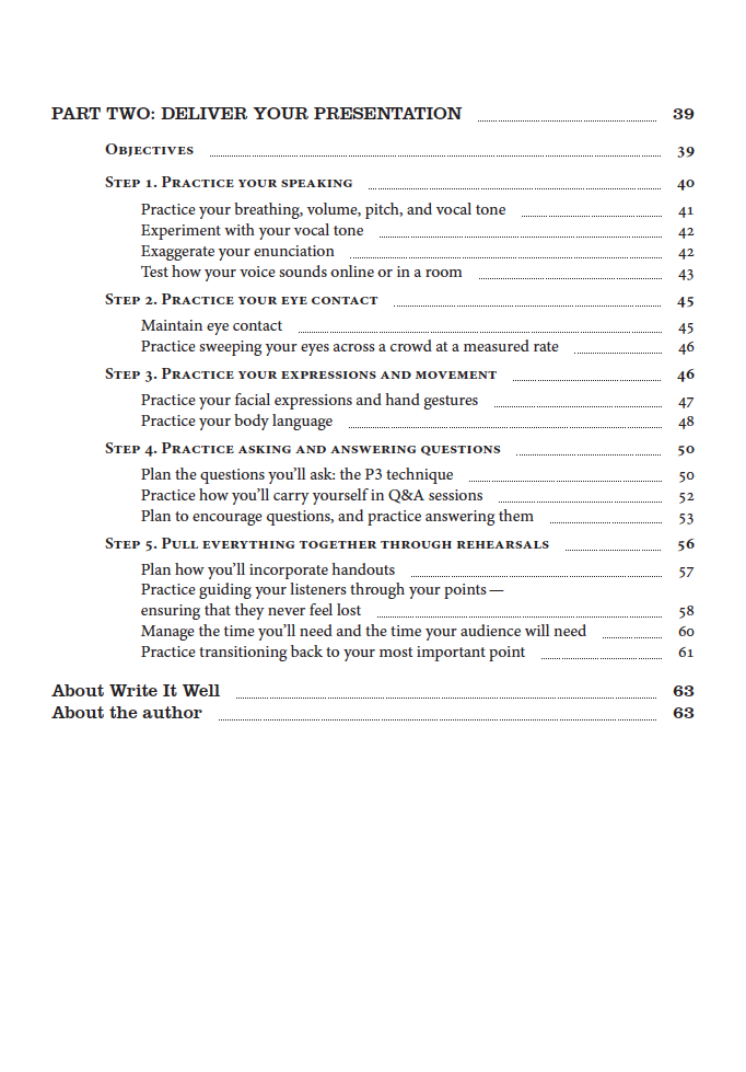 Terk starts the workbook with a straightforward five-step planning process to break the ice and articulate a clear message. The book concludes with a thorough five-step process to practice, rehearse, and deliver complex aspects of presentation delivery.