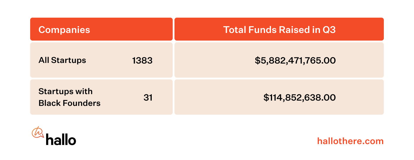 Hallo's research found that out of the 1,383 companies analyzed, 31 had black founders. The companies combined raised $5,882,471,765 with $114,852,638 being invested in black founder-led startups.