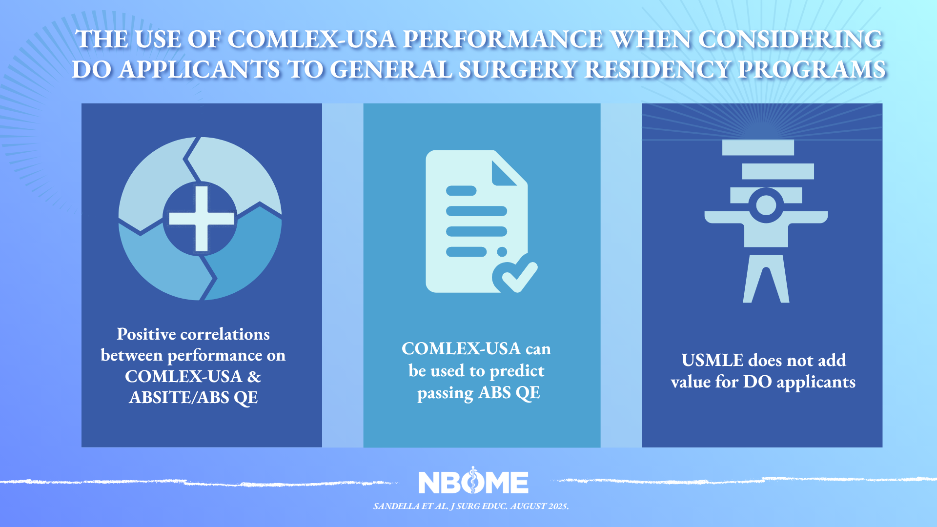 "This research provides surgery program directors with evidence and understanding of COMLEX-USA scores, so they will no longer ask DOs to take USMLE," said Jeanne M. Sandella, DO, lead author of the study and vice president for professional development initiatives and communications at the NBOME.