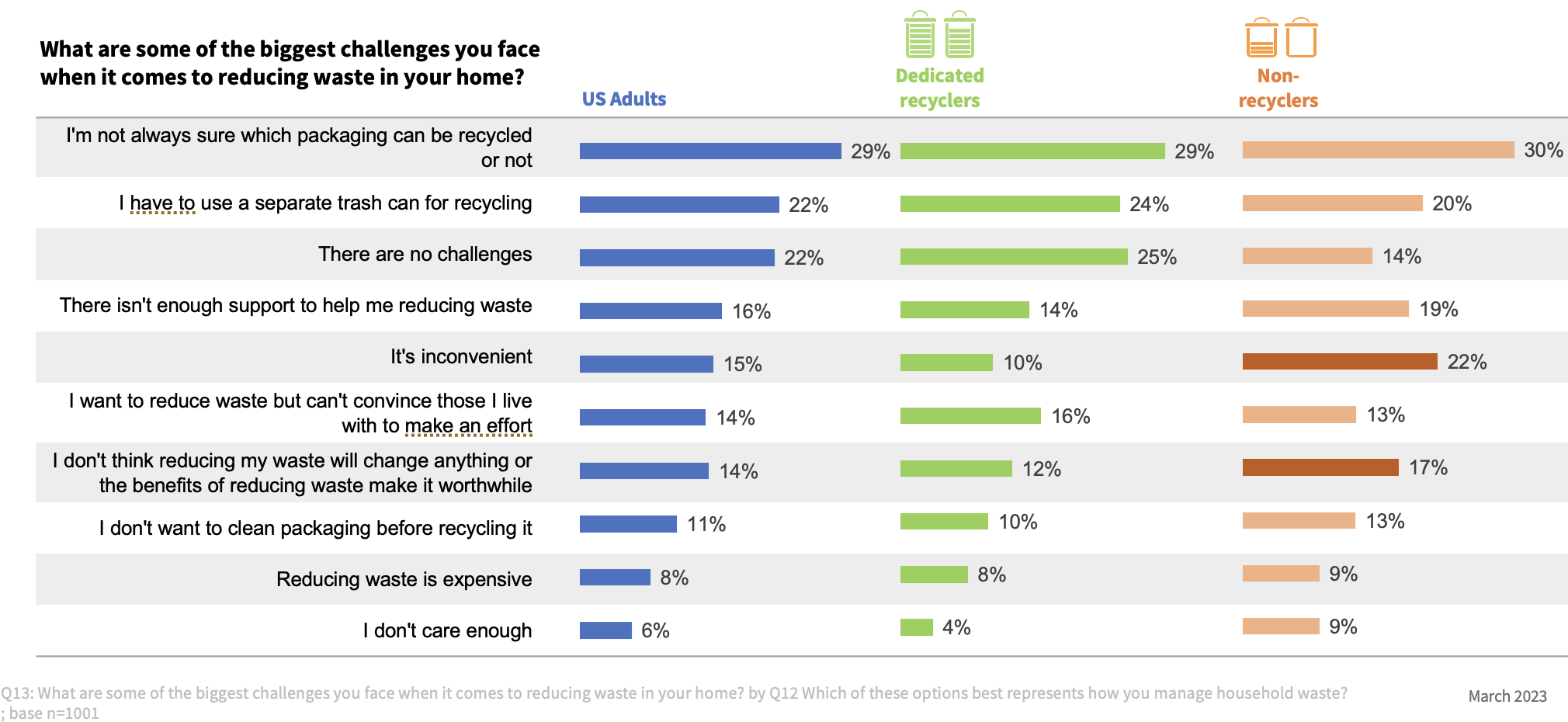 Make recycling clearer to understand and more convenient. A third of Americans, who try to recycle as much as possible, say the biggest challenge is knowing what can and can't be recycled. Manufacturers and packaging companies need to clarify what can be recycled and how. For Americans who don't recycle, four out of ten say the biggest barrier is the inconvenience. This includes tasks like separating their trash into separate bins or cleaning packages before they can be recycled.