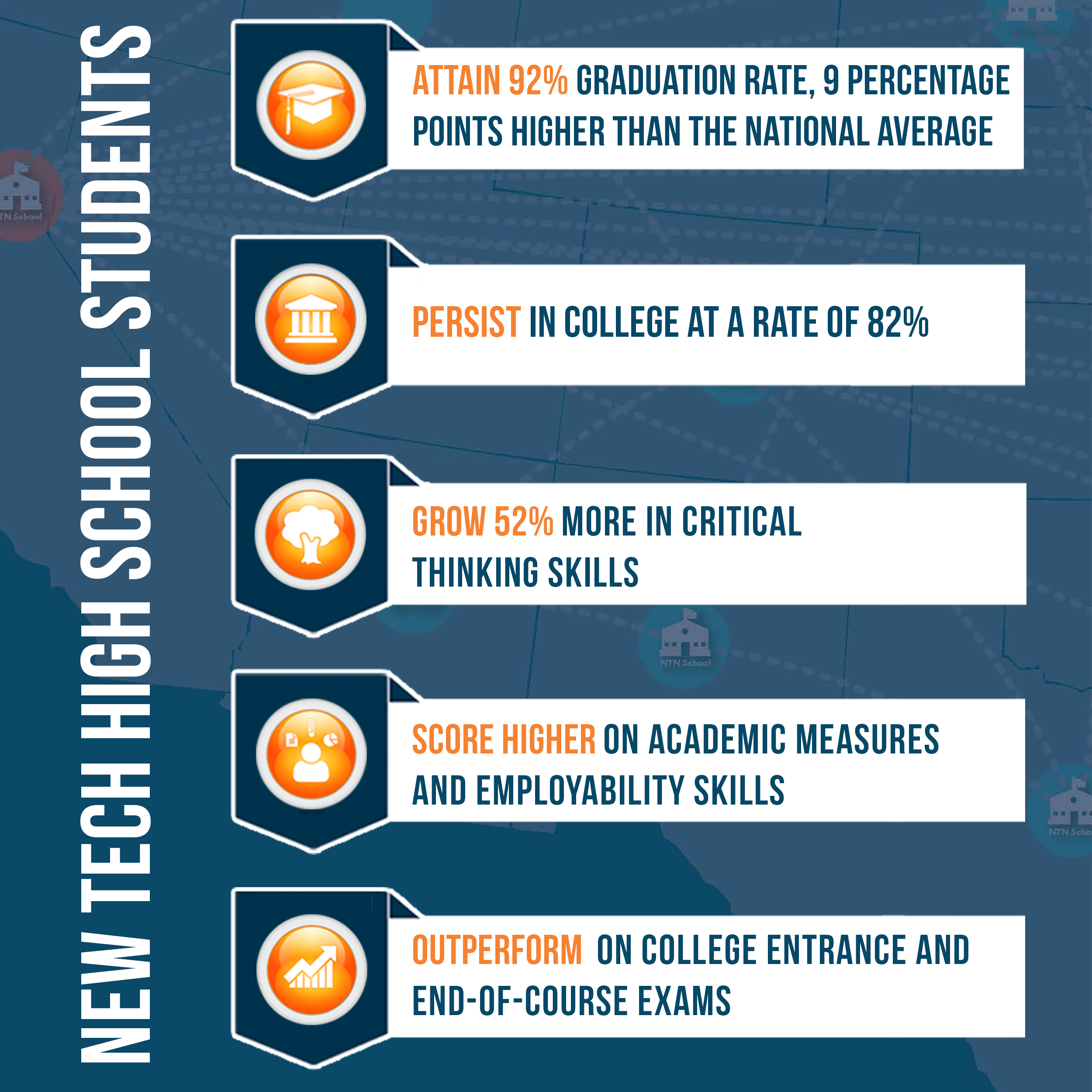 Eighty-two percent of New Tech students persist in college, compared to 78% nationally. Student experiences in New Tech schools result in students outperforming their counterparts, growing 52% more in higher order thinking skills between freshman and senior years than the comparison groups as measured by the College and Work Readiness Assessment administered by the Council for Aid to Education.