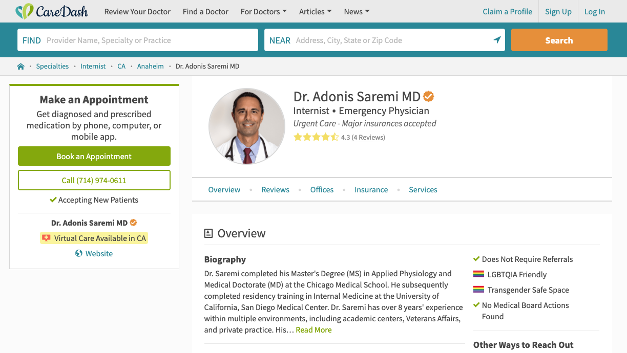 Headquartered in Cambridge, Massachusetts, CareDash is an online healthcare portal transforming the doctor review industry to make it more transparent and accessible for all patients. As well as verified patient reviews, it provides up-to-date information on a doctor’s conditions treated, procedures performed, bio and contact information, pharmaceutical payments and disciplinary actions.