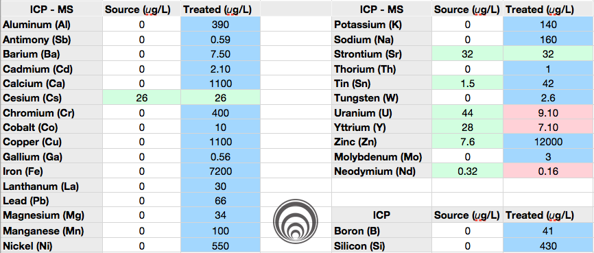 Figure 2: The elements fabricated and remediated post-treatment with the Electro-Physical Transmutation (E-PT™) process. Green is source values. White has zero value changes. Red is a reduction from source. Blue is the production of elements. Values in ug/L.