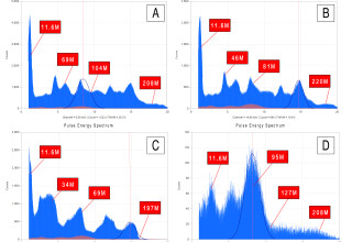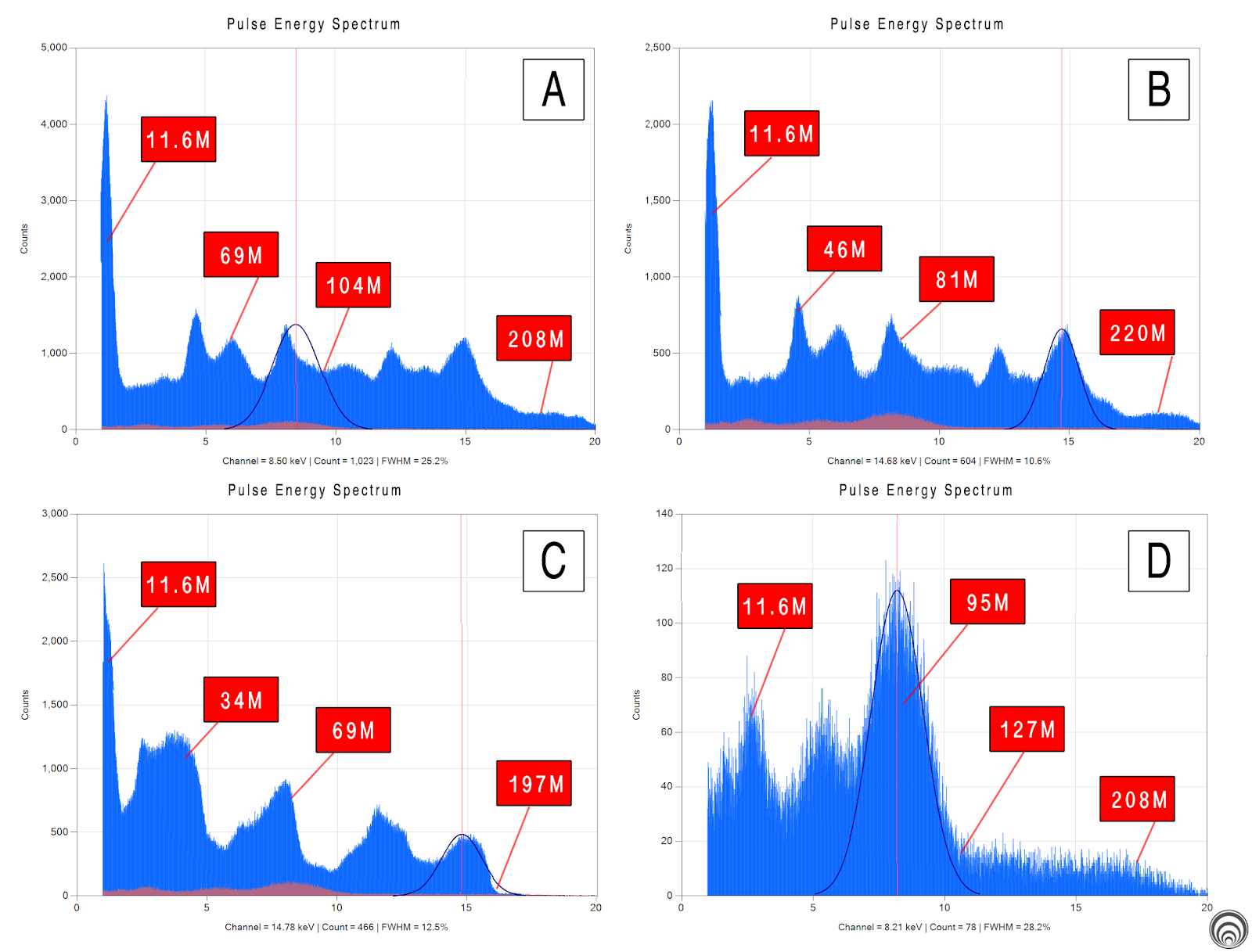 Figure 1: Plasma fusion (X-ray) temperatures while processing radioactive wastewater. At (a) 1-min into the experiment showing over >208 million degree Celsius. At (b) 2-mins into the experiment showing over >220 million degrees Celsius temperatures. At (c) 6-hrs into the experiment. (d) Temperatures after 24-hrs. RED emissions spectrum is the 24-hrs temperature overlay. The reactor behaved similarly to a stabilizing cosmological star cooling down by ~187% while still maintaining temperatures of 200 million degrees Celsius.