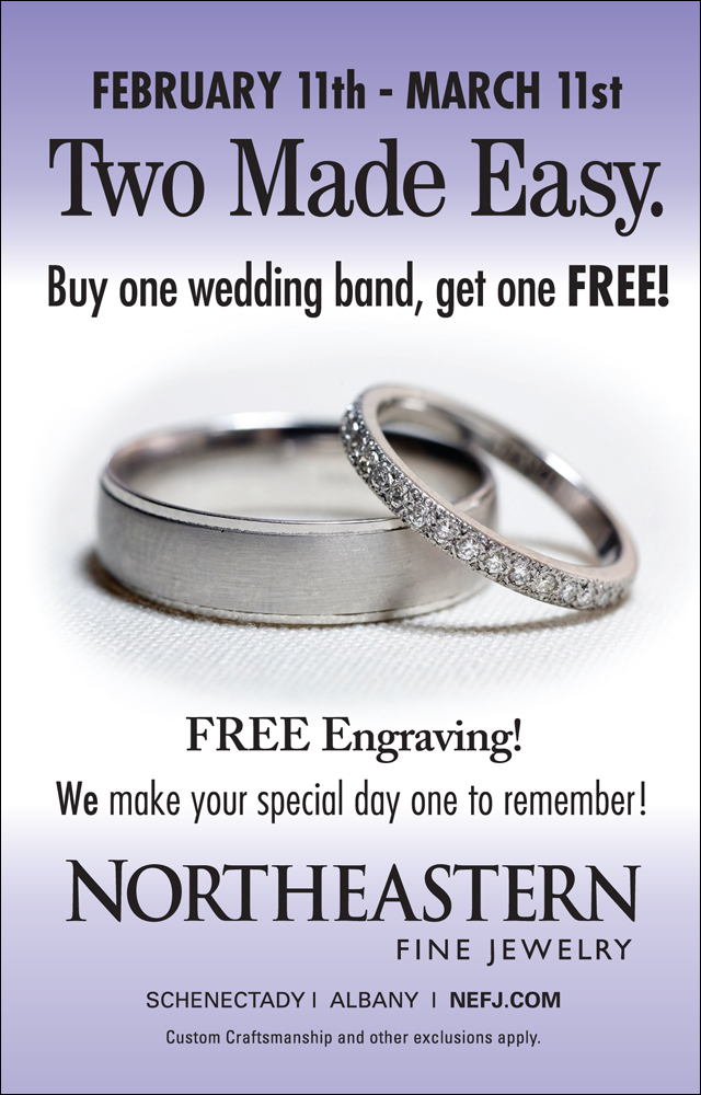 In addition to this once-in-a-lifetime “Buy One Get One Free” deal, extended to customers of the Albany and Schenectady showrooms of Northeastern Fine Jewelry is 90-day interest free financing, as well as complimentary engraving on all wedding bands purchased.