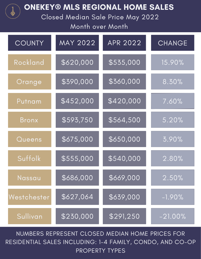 WEST BABYLON, N.Y., June 17, 2022 (Newswire.com) - OneKey® MLS is the one source real estate marketplace for monthly statistics for residential real estate transactions from Montauk to Manhattan, north through the Hudson Valley and the Catskill Mountains. For May 2022, OneKey MLS reported a regional closed median sale price of $605,000, representing a 4.30% increase over the reported $580,000 in April 2022. Between April and May 2022, closed regional sales transactions, including residential, condo, and co-op sales, increased to 5,173 from 4,647, representing an 11.30% month-over-month change.