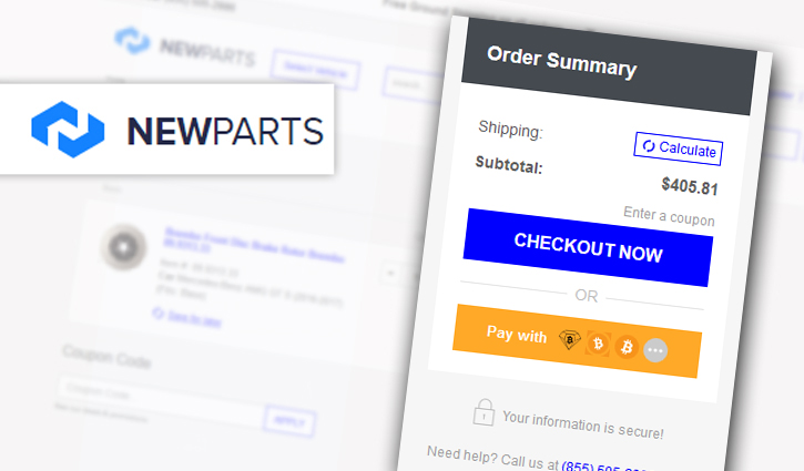 NewParts is an online auto parts retailer, offering a vast selection of automotive products at competitive prices, with a catalog of over one million parts. NewParts prioritizes the customer experience by accelerating deliveries through the strategically placed warehouses and by offering free ground shipping. NewParts' adoption of cryptocurrency payments will enable the company to expand its international reach.