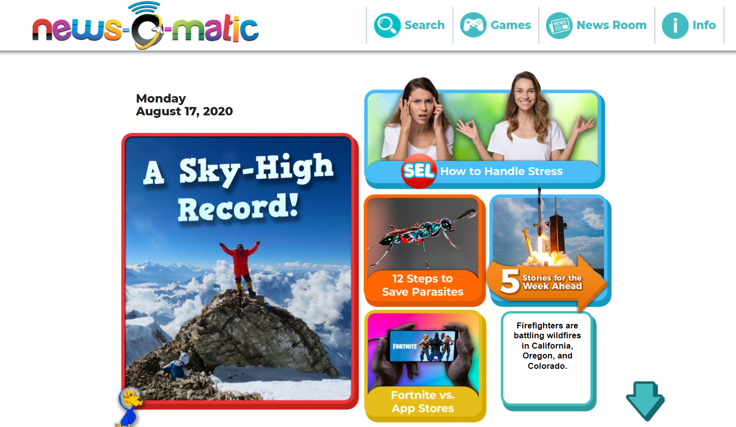 News-O-Matic was founded in 2013 as an educational resource designed to make nonfiction accessible and engaging for readers in grades K through 8. Every weekday, News-O-Matic publishes interactive daily news content that teaches children 21st-century skills such as critical thinking, media literacy, and global awareness. The news stories are written across various reading levels and are available in English, French, Spanish, and Arabic — in text and audio. Thousands of schools incorporate News-O-Matic articles into their literacy and social studies curricula. News-O-Matic has more than five million downloads from the App Store in 148 countries. It has also been recognized as a 2020 Teachers' Choice Award Winner. News-O-Matic is available on the web, in the App Store, and on Google Play.