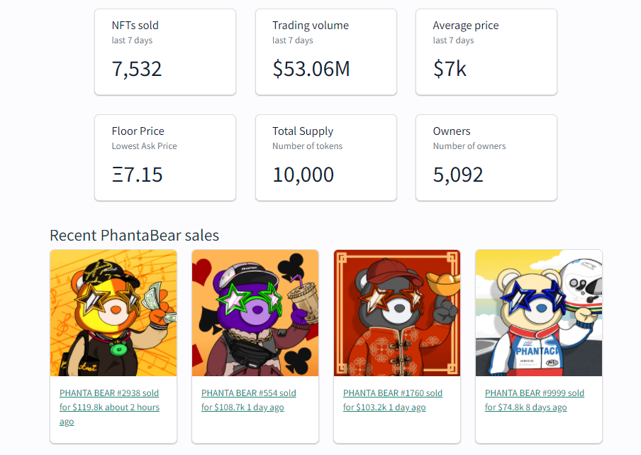 It is the first time in history that an NFT series has risen to the top of the global sales rankings in such a short period of time. The Bored Ape and Cryptopunk NFT series, which rose to prominence in a matter of months, originally set the record. The PhantaBear's 10,000 NFTs, which cost more than $1000 USD each at the time, were sold out in less than 40 minutes. Since then, the value of each NFT has increased by more than threefold with the total value of the NFTs valued at $53 million USD at the time this article was published.