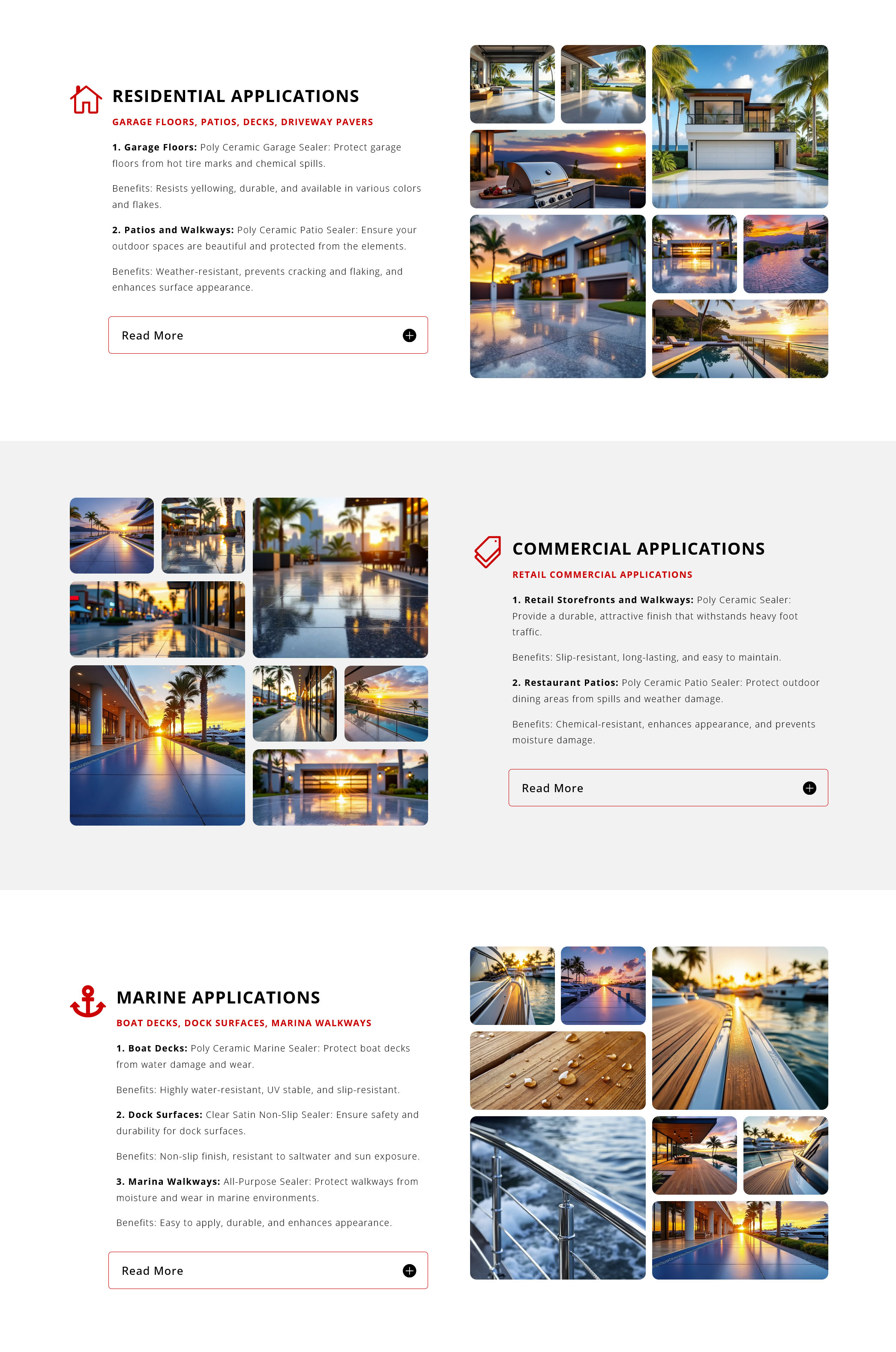 Garage Floors: The Poly Ceramic Garage Sealer prevents damage from hot tire marks and chemical spills, with benefits like resistance to yellowing and customizable colors.