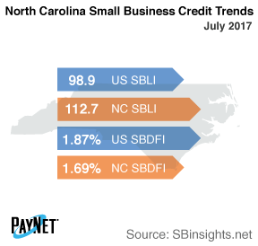 At 112.7, North Carolina's PayNet Small Business Lending Index (SBLI) rose 1.2% from last month's state level and was 14.0% higher than the national SBLI level of 98.9 this month. We can cautiously anticipate improving financial conditions in North Carolina based on recent small business investment.