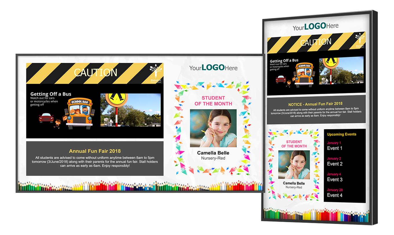 From displays in school’s lobby to beautiful freestanding HD kiosks, ViewSonic and NoviSign offers schools a variety of digital signage solution options. Use NoviSign’s digital signage software for education to create media-rich content that features school announcements, media slideshows, HD videos, campus notifications and more. Create a template from scratch or customize a professionally designed template.
