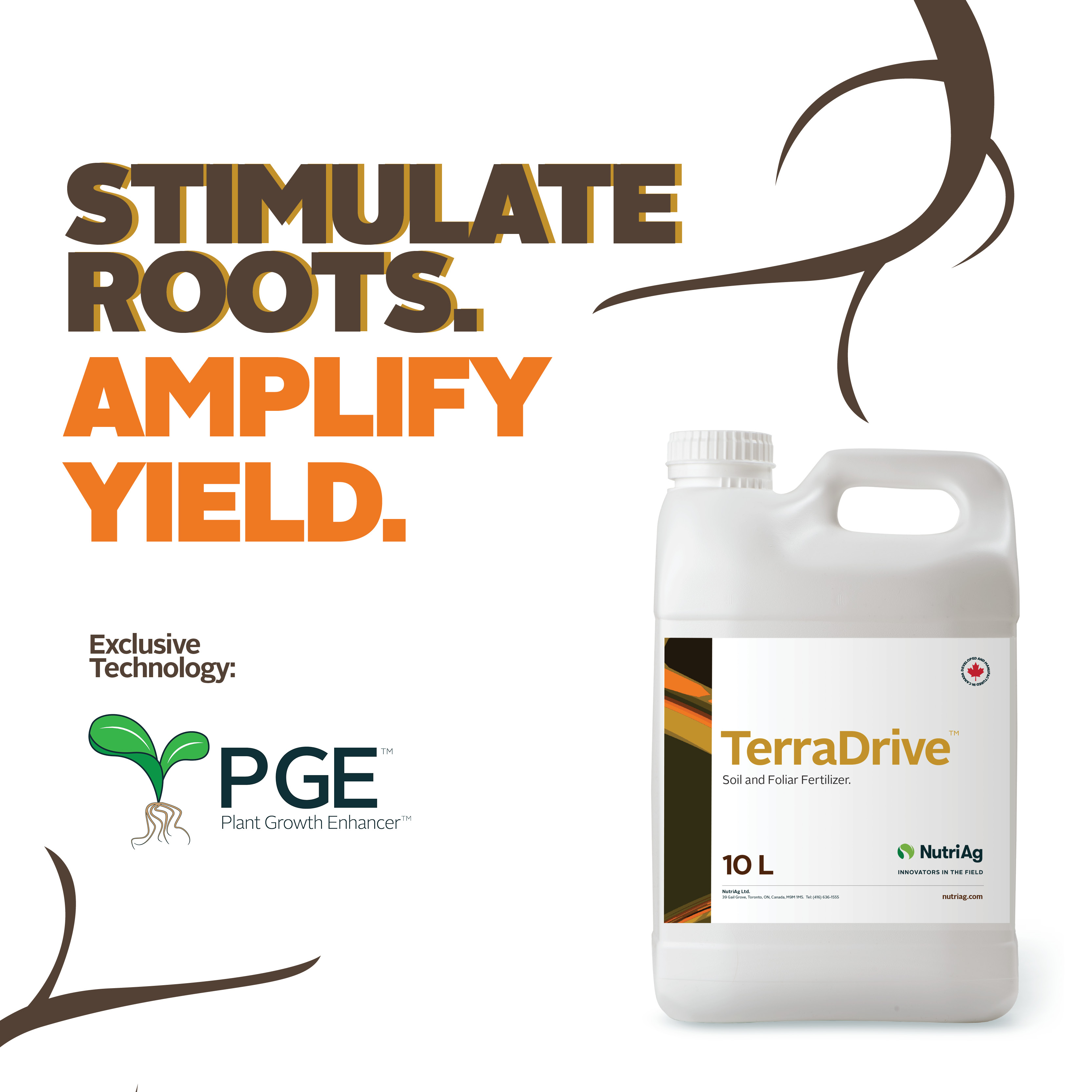 TerraDrive™ is a new and unique micronutrient fertilizer that enhances root growth and development. It contains exclusive PGE™ (Plant Growth Enhancer) technology, which is formulated with plant growth stimulants to optimize overall crop development. This also marks NutriAg’s first registered product containing plant growth stimulants.