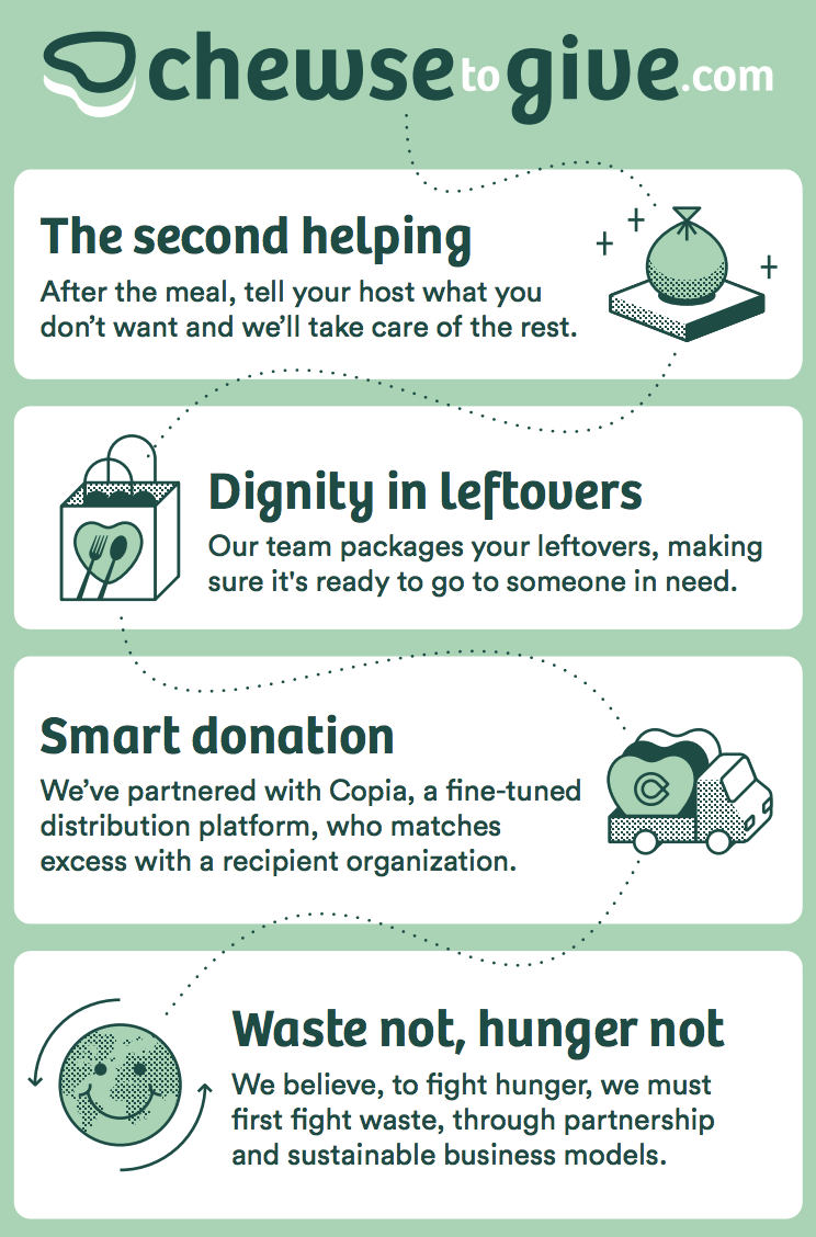 SAN FRANCISCO, May 21, 2019 (Newswire.com) - In-office catering company Chewse announces the launch of Chewse to Give. As part of this community impact program, Chewse is thrilled to announce a strategic partnership with the food recovery experts at Copia. With this new partnership, Chewse will work with clients to recover unwanted, uneaten food and Copia will deliver it to local recipients who need it most. This program is available in all of the markets Chewse serves: San Francisco, Silicon Valley, Los Angeles, Austin and Chicago (opening in July).