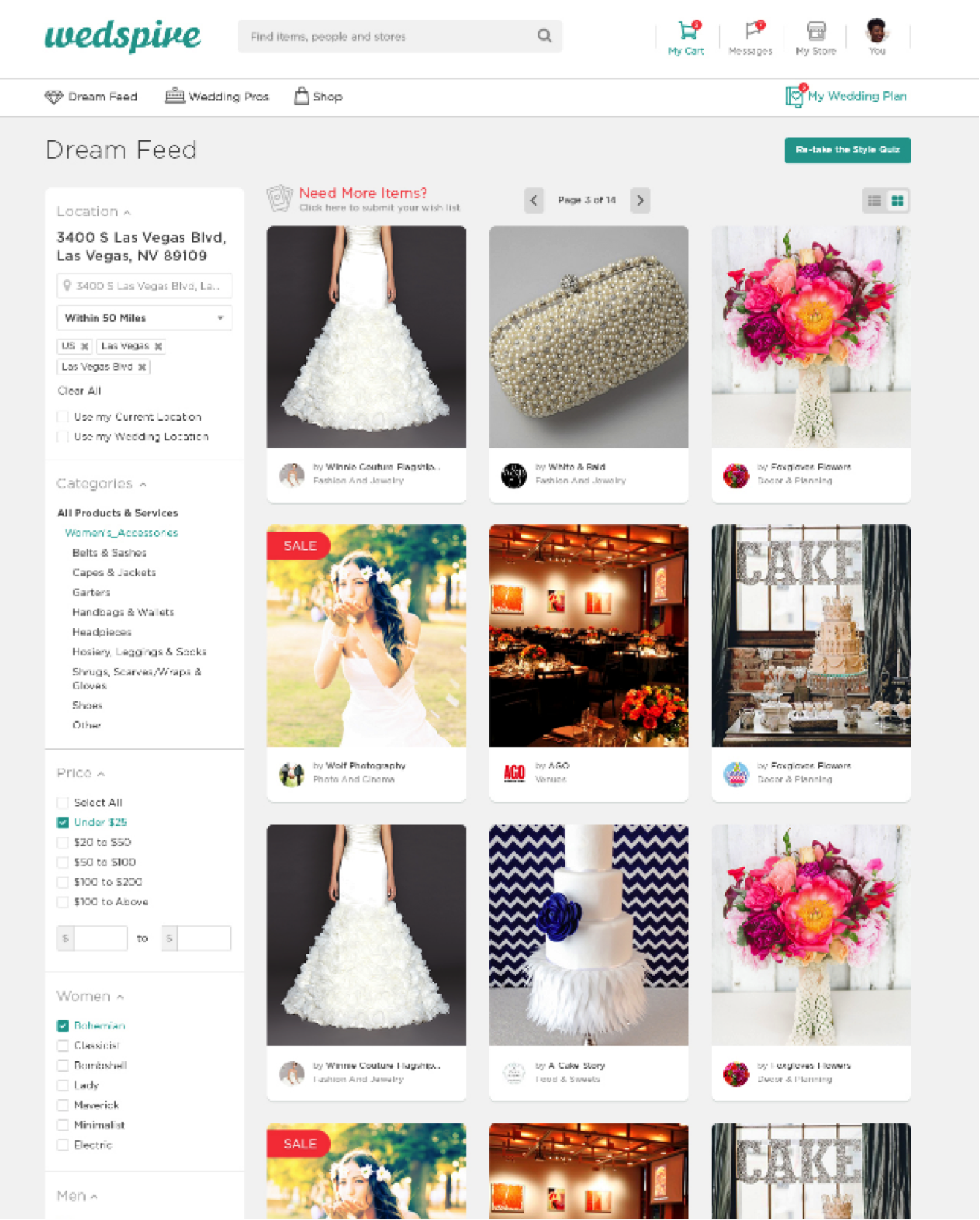 New couples enjoy a curated Neflix-style feed of shopable items - from wedding cakes to that perfect dress and more. Comprehensive style quizzes filter wedding needs based on style, budget and location into a unique ‘dream feed’ of items that are actually available for purchase. In addition to innovative planning tools, Wedspire allows the couple to shop while their budget dynamically updates based on their purchases. Throughout the entire process, from inspiration to check out, Wedspire allows and encourages collaboration between family, friends and wedding pro’s.