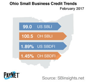 The PayNet Small Business Lending Index (SBLI) for Ohio was 100.5, surpassing the national SBLI level of 99.0 and performing similarly to the previous month's state level.