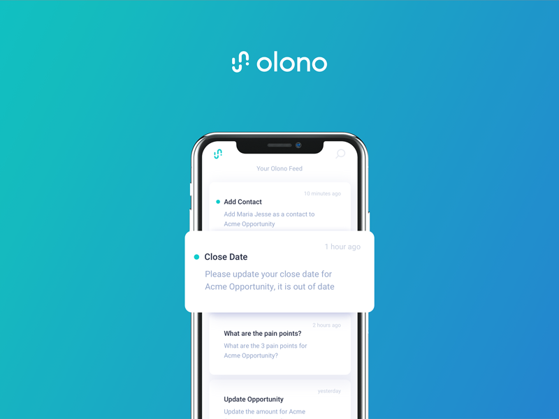 With Olono mobile, we're bringing the benefits of automation directly to field reps, using machine learning to predict patterns of success and then guide reps. Olono makes it easy for sales pros to know and take the next best action regardless of where they are or what challenges their deal is facing.
