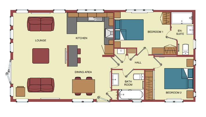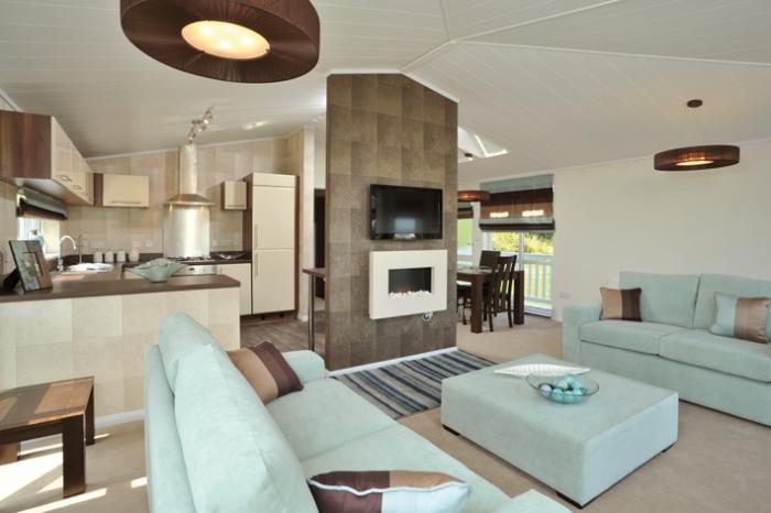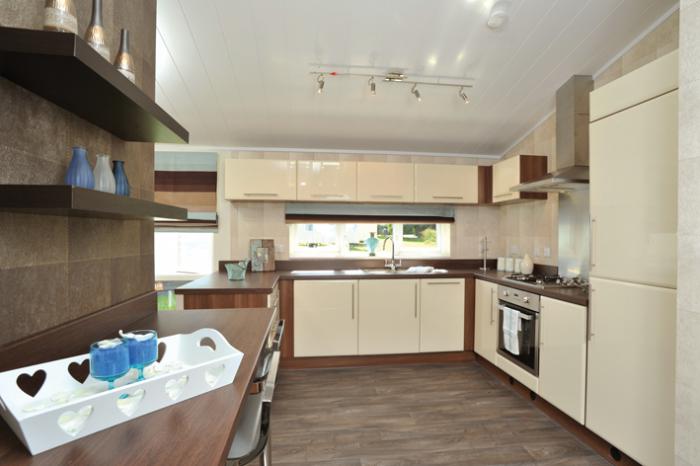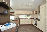 Apex lodge is an extravagant, beautifully furnished park home; it is semi open plan with Belgium Chenille sofas, Roman blinds and full-length feature windows. There is a clever central feature to the kitchen/dining room/living area that houses the TV and wall-hung fire. Both bedrooms have double beds, the master bedroom features an ensuite with a large, fully tiled walk-in shower. They both boast wall hung basins, vanity units and stylish LED vanity mirrors.