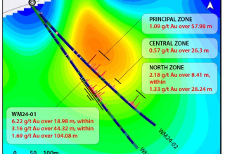 With the encouraging follow-up results from the 2024 drill program and the historical 2022 results, Omega has >600 lateral metres of gold mineralization between the holes of this news release and WM22-03 (Figure 1). This envelope of gold mineralization is still wide open to the east and west representing several kilometres of potential strike length to explore. Further to the potential expansion east and west of the three zones, it is important to note that they are also open to expansion closer to surface and to depth. The principal and north zones have been intersected at ~250 and 390 vertical metres from surface, respectively. This leaves an abundance of room to grow these zones towards surface with shallow drilling.