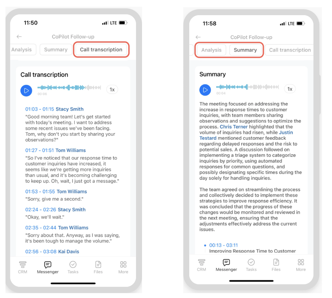 Mobile users can also jump straight to specific moments in a call using timestamps in the transcript. Finding a key agreement or recommendation takes seconds. It is an ideal solution for fast-moving teams that need results without slowing down.