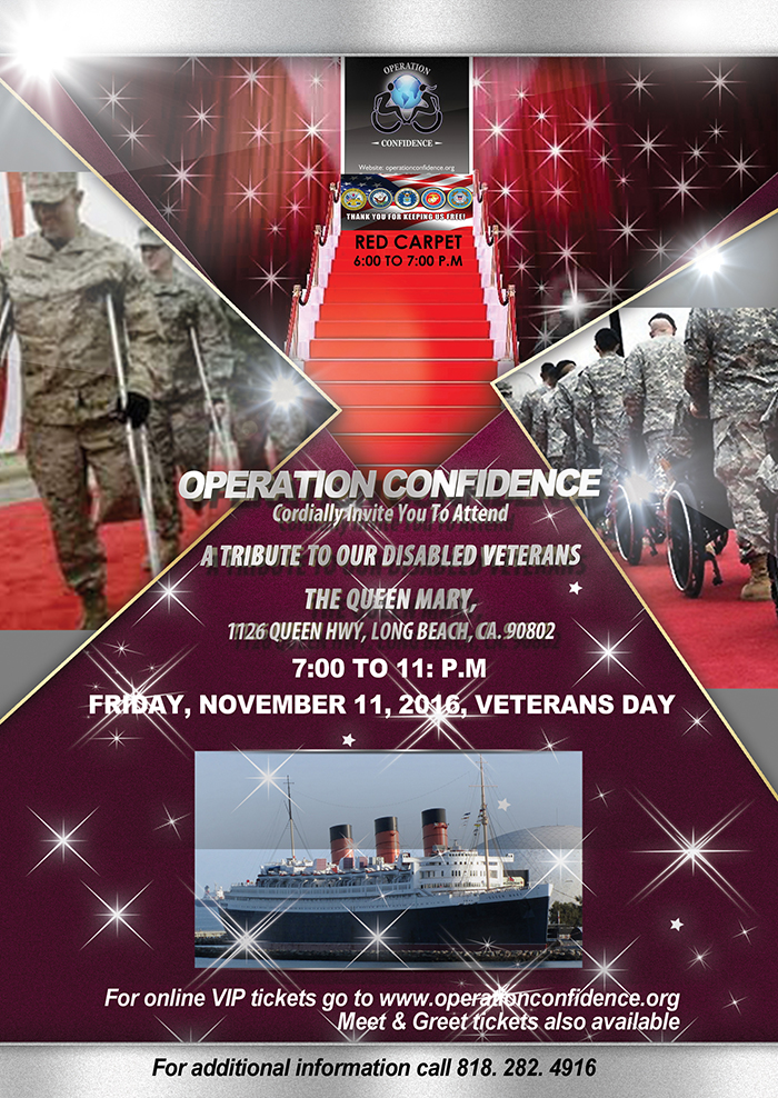 Long Beach, CA , October 26, 2016 (Newswire.com) - On Veterans Day, Friday, November 11, 2016, Operation Confidence will host a Tribute To Our Disabled Veterans, aboard the historical Queen Mary, in Long Beach, Ca. from 7:00 to 11 P.M. Red Carpet 6:00-7:00 P.M.