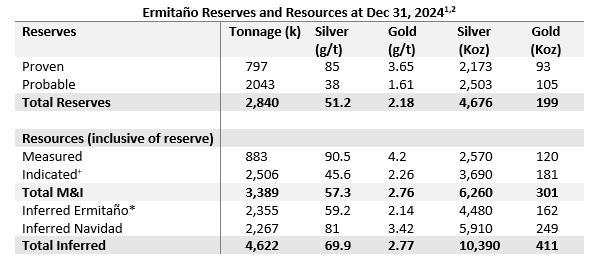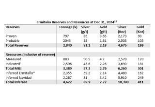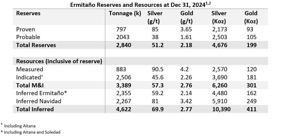 The Ermitaño vein was discovered in 2016 and developed into a producing underground mine at the end of 2021. Exploration drilling by First Majestic in 2021 identified the Luna vein to the east of the Ermitaño mine and, in 2023, the Navidad vein system to the west (Figure 1), both of which have been included in the 2024 resources. Current reserves and resources are as follow: