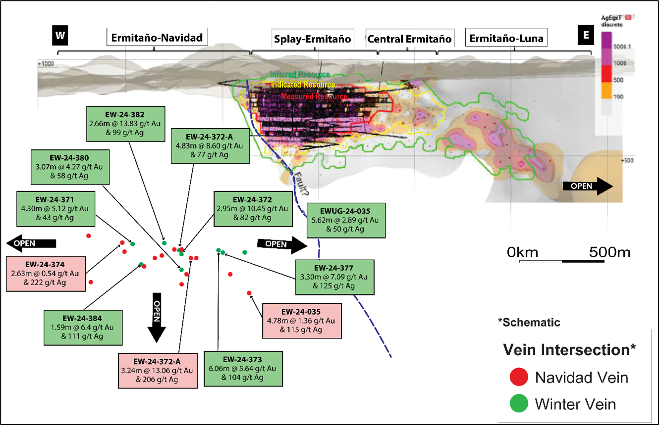 Several areas of mineralization within the Ermitaño mine complex remain open including the Luna vein to the east and the Navidad and Winter veins in multiple directions.