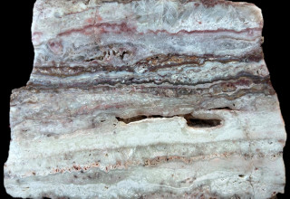 The property is cut by widespread veining with vein widths locally exceeding three metres and returning anomalous precious metal values of up to 2.62 g/t gold and 49.7 g/t silver. The multiple outcropping veins display textures including crustiform-colloform fine-grained quartz and coarse silica after platy calcite typical of low-sulphidation epithermal veins (Photo 1).