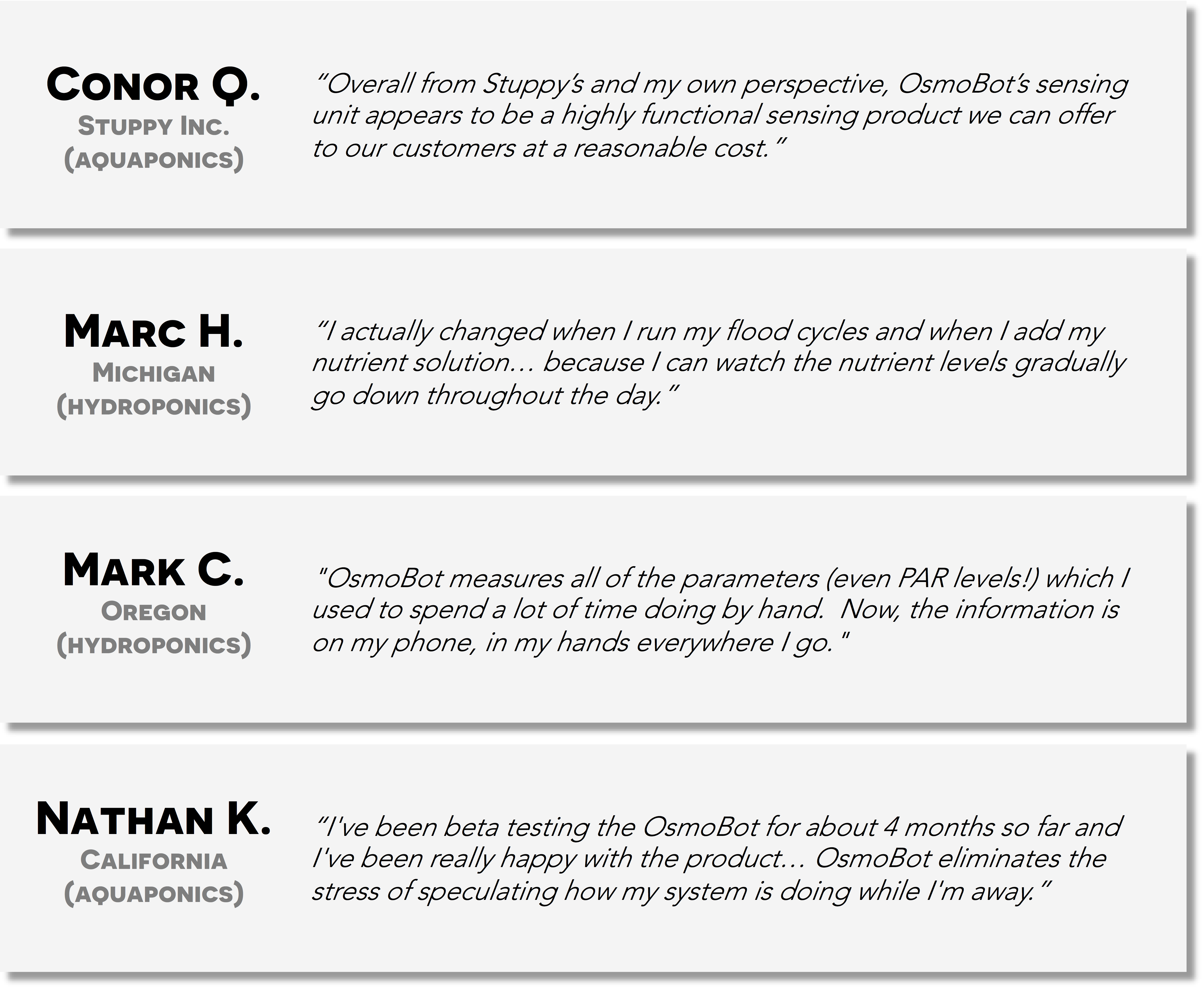 The company recently concluded its beta test. From June - October, 2016 Osmo Systems shipped over 60 OsmoBot Hydros to testers both in the United States and internationally. These testers included universities, commercial greenhouses, and hobbyists, and were a mix of hydroponic, aeroponic, and aquaponic systems. Reviews and testimonials from the beta test can be seen on Osmo Systems’ Kickstarter campaign.