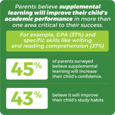 While parents identified several academic areas where they would expect to see improvement in their children from a supplemental learning program, such as GPA (37%) and specific skills like reading comprehension and writing (37%), the top potential improvement cited was increasing their child's confidence (45%). Improving study habits (43%) might also lead parents to turn to supplemental programs.