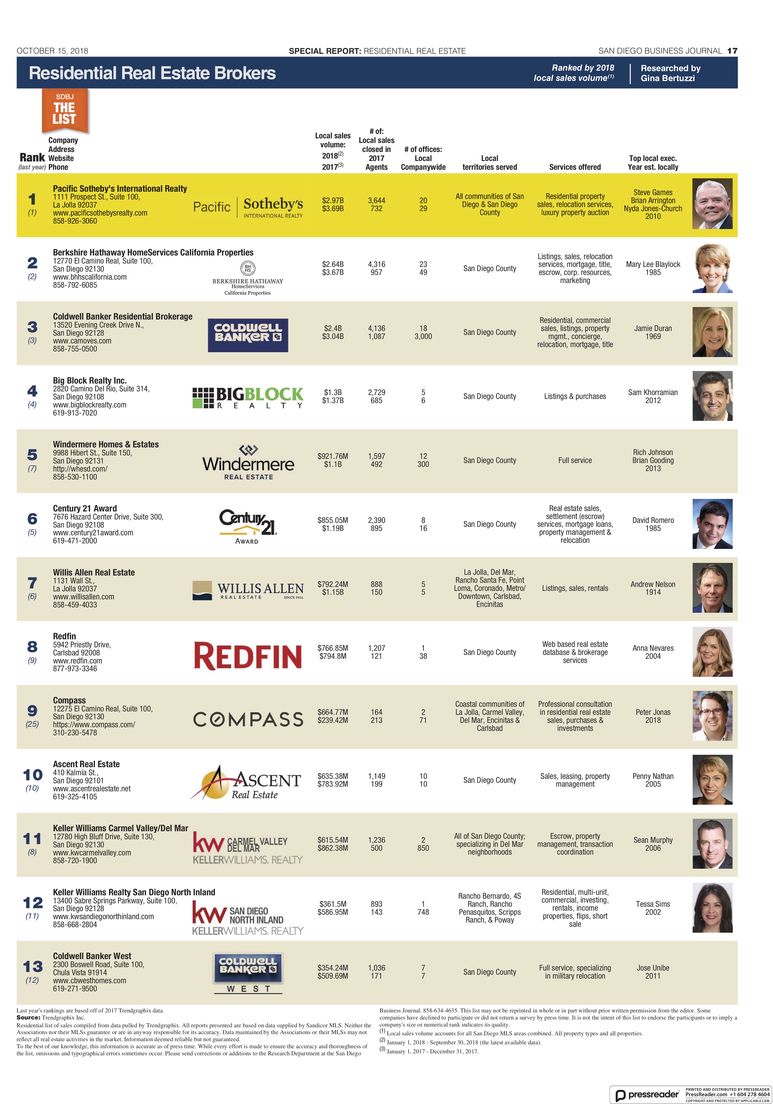 SAN DIEGO, October 30, 2018 (Newswire.com) - The San Diego Business Journal (SDBJ) provides a rigorously researched database for San Diego’s most distinguished businesses. Pacific Sotheby’s International Realty was ranked the top Residential Real Estate Broker in San Diego and San Diego County based on 2018 total sales volume to date, according to Trendgraphix Inc.