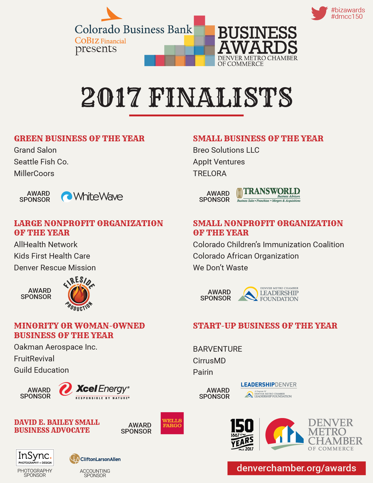 The awards are hosted by the Denver Metro Chamber of Commerce and winners will be announced at the annual awards luncheon, taking place on Thursday, April 27, 2017, from 11 a.m. - 1 p.m. at the Infinity Park Event Center. Awards are given in a total of six categories including small business, start-up, green business, small nonprofit, large nonprofit and minority or woman-owned business.