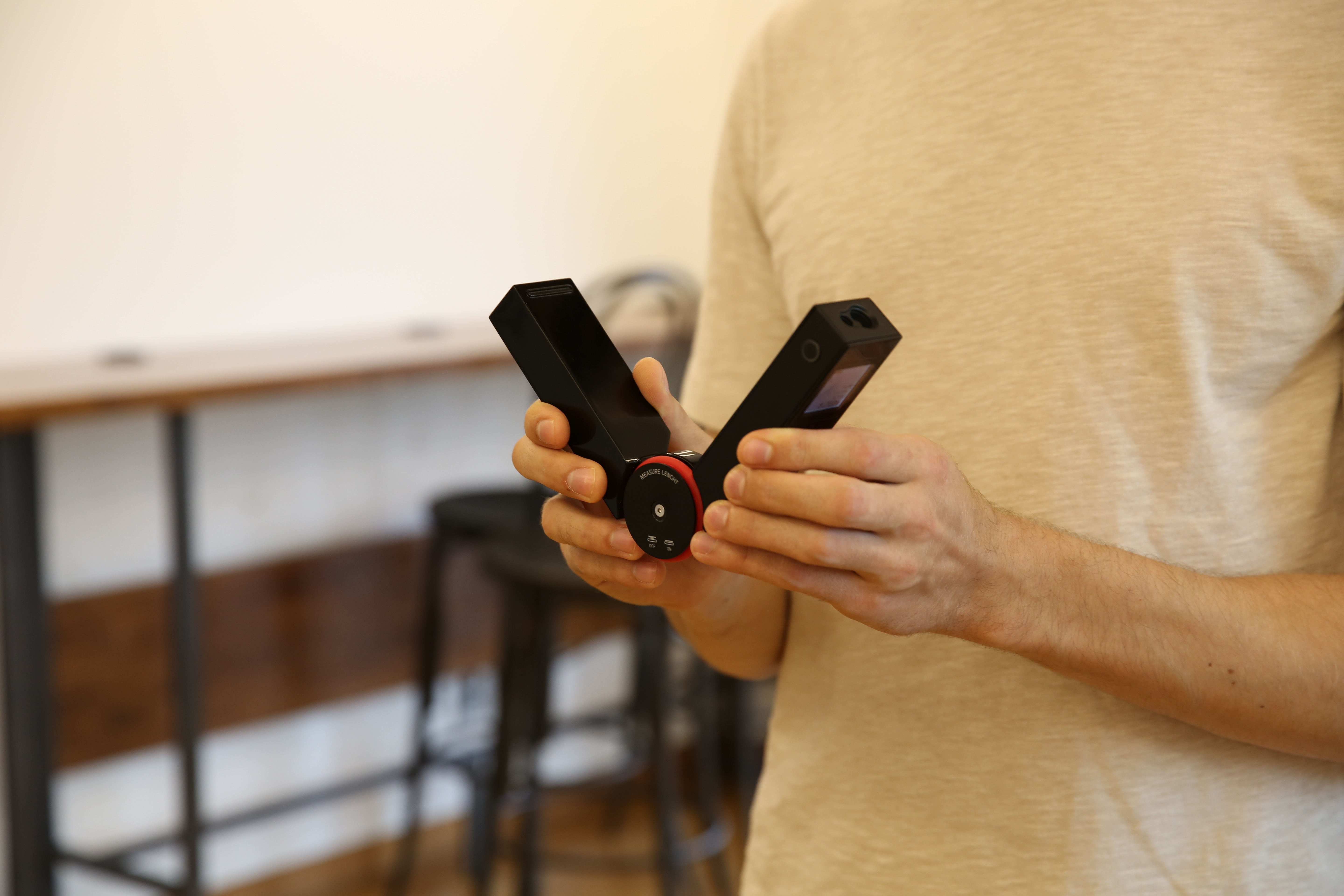 The synthesis of the Pythagorean formula and laser technology is what differentiates PARA. Current laser measurers that house only one outsource of light are limited to measurements of closed spaces. Yet, PARA’s dual-ended lasers, expandable design and smart angle encoder allow users to simply point the two lasers and measure any distances between them. This means users can measure open spaces from any position.