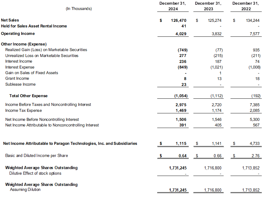 Paragon Technologies, Inc.'s Consolidated Statement of Operations for the twelve months ended December 31, 2024, are summarized below. For further detail on our results, shareholders should carefully review our annual report, which can be found at www.pgntgroup.com. The company will be hosting a call for shareholders in late April. Details will be provided on the company's website and through a separate press release providing the timing and call-in details.
