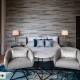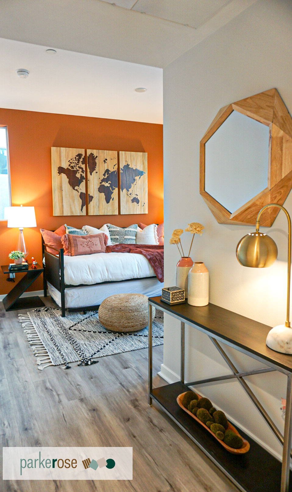 The team at Parker Rose Design created a unique home at Coolidge Place to emphasize the thriving, vibrant, and youthful area. The design is described as a combination of mid-century and eclectic, with interesting textures and patterns on the textiles in the home. Chloe Watkins, a junior designer at Parker Rose Design, also reached out to local artists to donate pieces to the project to showcase and support their work.