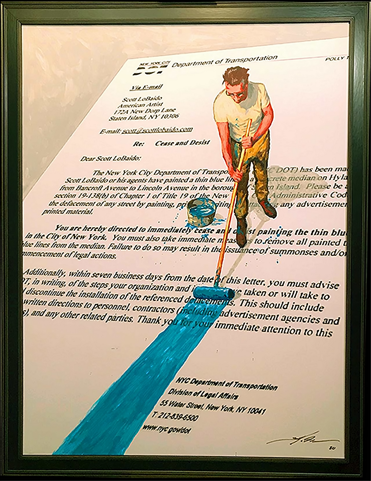 NEW YORK, September 25, 2020 (Newswire.com) - Patriot Artist Scott LoBaido whose gear is now being sold at The Patriot Mall, raised more than $13 thousand dollars for the NYC Cops & Kids Boxing Club. LoBaido raised the funds by creating a work of art from a cease and desist letter sent to him by New York City Department of Transportation after he painted a blue line on a street median outside the 122 Police Precinct in Staten Island. The letter stated that LoBaido painted the line without a permit and directed him to remove it or face consequences.