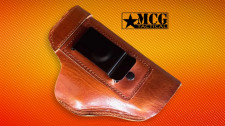 According to publicly listed information on the brand's website, the PeaceKeeper is an inside-the-waistband leather holster manufactured and sold by MCG Tactical, a company with a published address in Plano, Texas. It is designed specifically for right-hand draw from a strong-side IWB carry position.