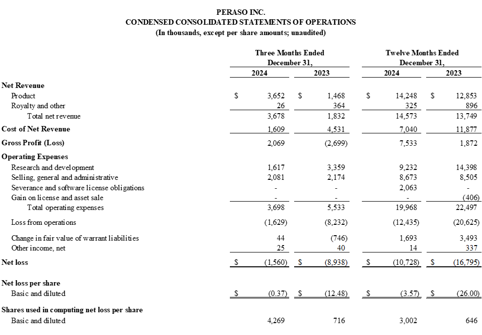 Peraso Announces Fourth Quarter and Full Year 2024 Results