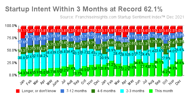 NORFOLK, Va., January 6, 2022 (Newswire.com) - In late December 2021, the percentage of aspiring owners who expected to start their businesses within the next three months reached 62.1%, the highest percentage ever recorded. Further, 88.2% of these aspiring owners see business conditions about the same or getting better in the next three months, according to the Small Business Startup Sentiment Index™ by FranchiseInsights.com.